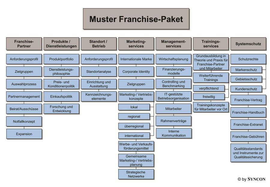 - Erstellung des Franchise-Paketes: Neben einem erfolgreichen Betriebstyp sind die Serviceleistungen, die die Franchise-Zentrale für ihre Partner erbringt, von wesentlicher Bedeutung für den Erfolg des gesamten Systems (siehe nachfolgende Grafik).